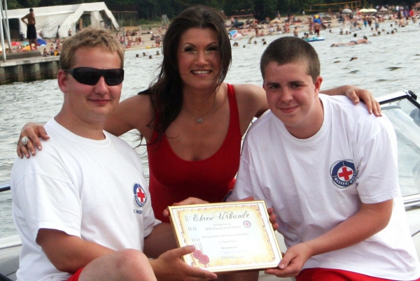 Die jungen ehrenamtlichen Retter der DRK Wasserwacht retteten am 9.Juli '08 am Wannsee sechs Kinder vor dem Ertrinken. Antonia als Ehrenmitglied bekräftigt gerade nach so einem Vorfall wie wichtig der Einsatz dieser Menschen ist und überreichte eine Ehren-Urkunde für diese besondere Leistung.